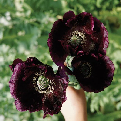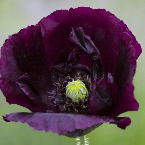 We get shivers down our backs from this haunting bloom. Huge, silky flowers in burgundy-black are ravishing in the garden and vase. For cut flowers, harvest when the petals are half open and sear the end with a flame immediately after cutting. Left on the plant, After Midnight produces 2 inch rattlepods that last indefinitely in dried arrangements, or break them open to enjoy the delicious breadseeds inside. Approximately 2,500 seeds per gram. Germination code: (4)