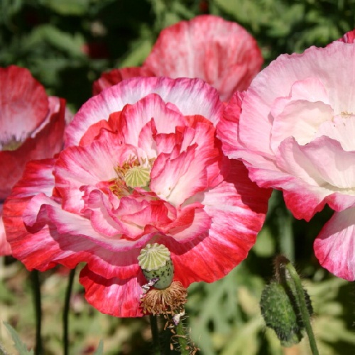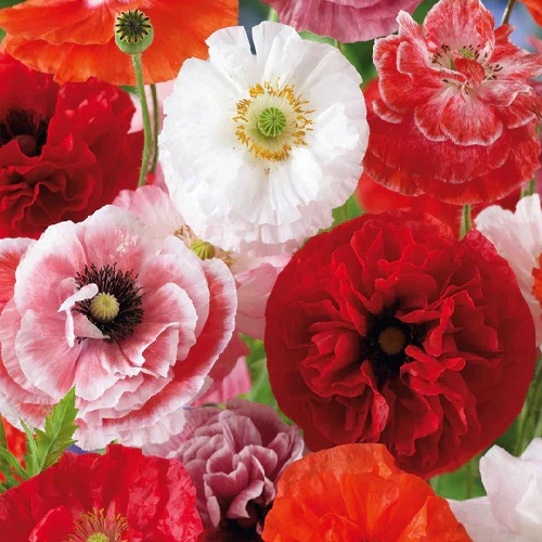 This 2–3 foot poppy bears mostly double, 3–4 inch crinkly blossoms in bright red, salmon, pure white, and light pink. Very delicate in appearance, and long lasting as a cut flower if the cut end is burned immediately with a match. Sow successively for bloom from spring through summer and late into the autumn.